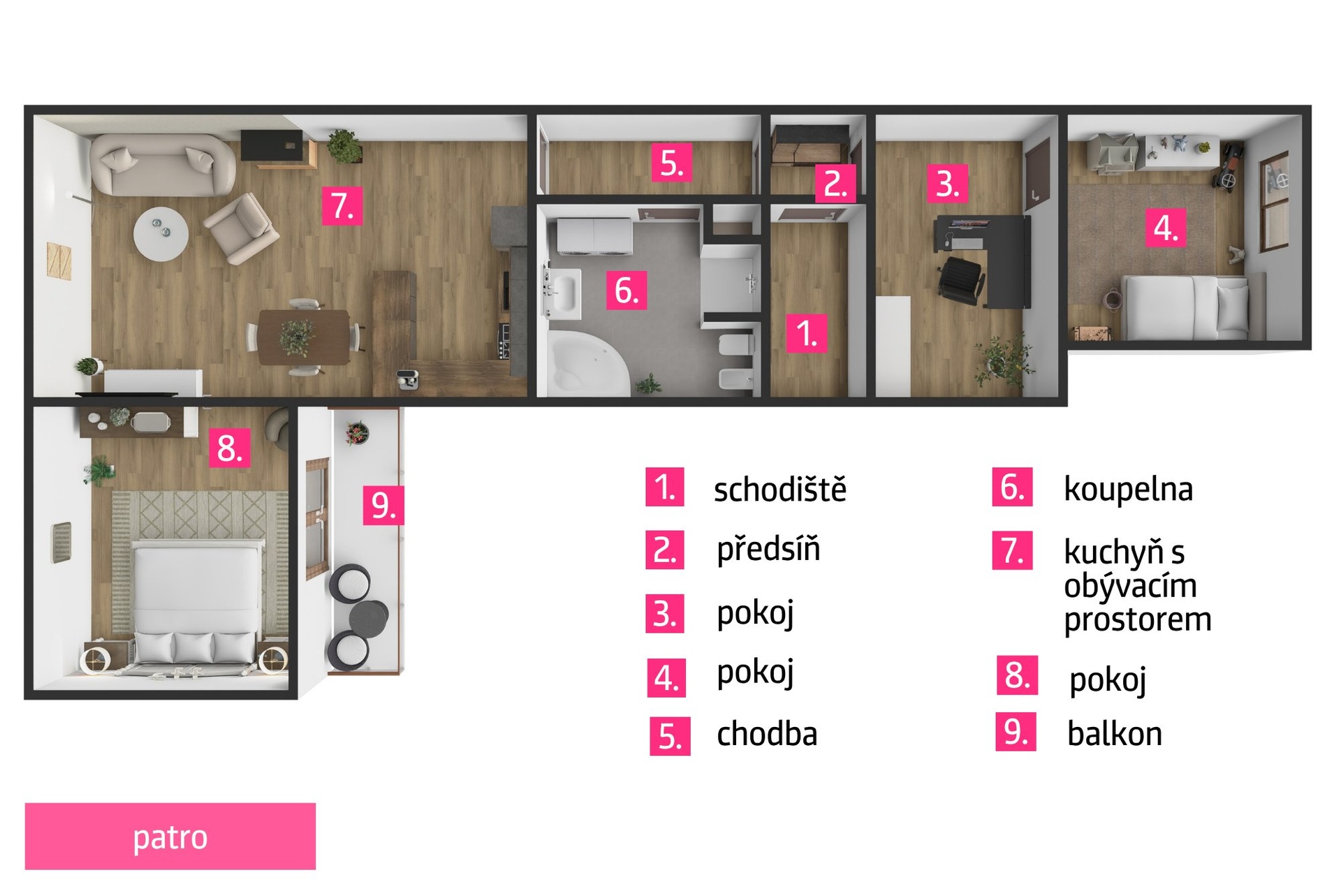 - balkon 5 m², sklep cca 10 m² a další úložné prostory