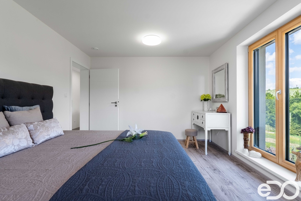 Dům je nízkoenergetický, vytápěný tepelným čerpadlem, s podlahovým topením, rekuperací a elektrickými roletami. Dispozice nabídne prostorný obývací pokoj s výstupem na terasu s krásným výhledem, kuchyňský kout, ložnici, tři další pokoje, koupelnu i technické zázemí. Ať už hledáte další pokoj, klidnou pracovnu nebo vlastní domácí fitness, tady si prostor přizpůsobíte podle sebe. 945 m² zahrady znamená prostor pro děti, bazén, grilování i klidné zahradničení. Mírný svah nabízí možnost vytvořit terasy nebo zajímavé zahradní prvky. Oplocení zatím není realizováno, což dává příležitost zvolit si styl i míru soukromí podle sebe. K domu máme připravenou i virtuální prohlídku, díky které si nemovitost projdete z pohodlí domova – rád Vám ji zašlu.