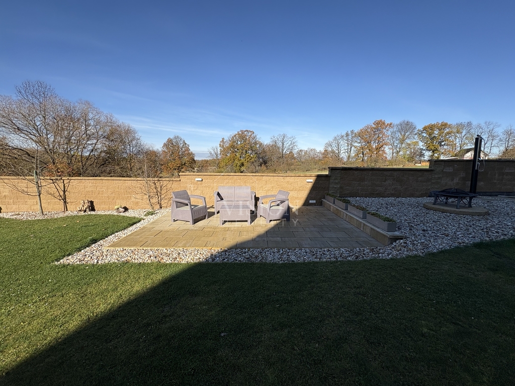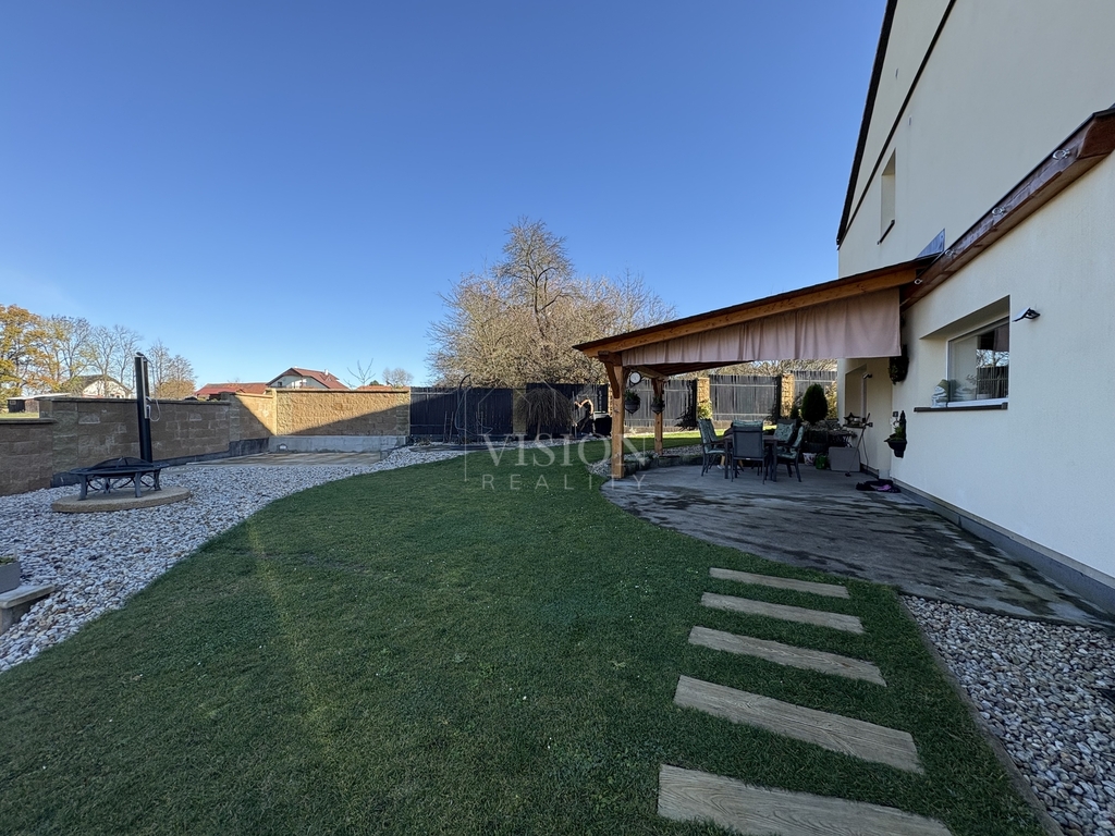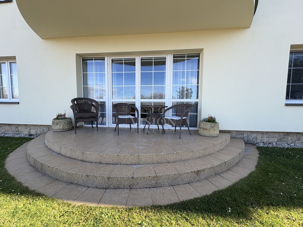 Součástí bytu je vlastní terasa, dále je k dispozici zahrada s velkorysým posezením, možností grilování a bazénem.