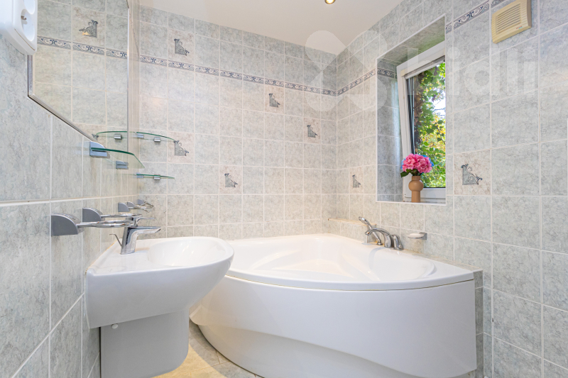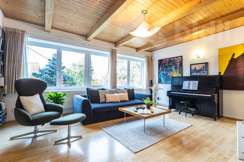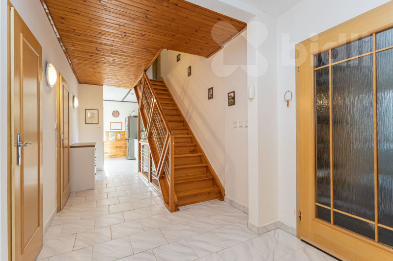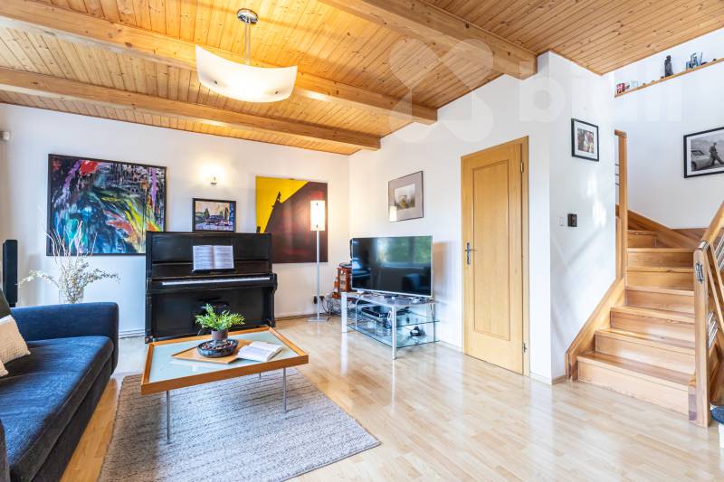 -kuchyně s americkou lednicí LG, jídelna se vstupem na terasu a zahradu, pokoj pro hosty s vestavnými skříněmi, obývací pokoj s krásným trámovým stropem, 2 koupelny s rohovými vanami a 2 toalety, z toho jedna samostatná,