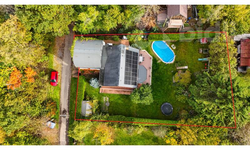 -zabudovaný vyhřívaný bazén s protiproudem, dětské hřiště a posezení s grilem, dřevěný domek na kola, zahradní nářadí a další.