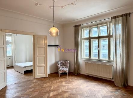 Světlý byt je orientovaný do tří světových stran, má velký obývací pokoj a prostorná je i ložnice. Nájemníci budou mít k dispozici malý balkón v mezipatře a sklepní kóji.