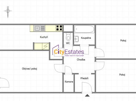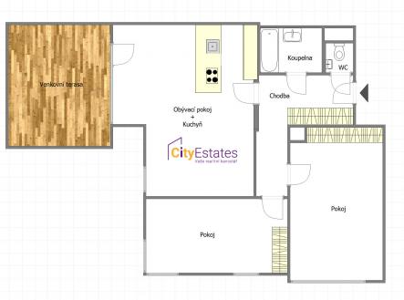 Při vstupu do bytu vejdete do prostorné haly 12,5 m2, ze které vcházíte do všech místností v bytě. Na sever orientovaná ložnice cca 18 m2, dále koupelna s vanou, samostatné WC, obývací pokoj s kuchyňským koutem 18 m2 a malou komorou. Z haly vejdete také na menší zasklený balkon.