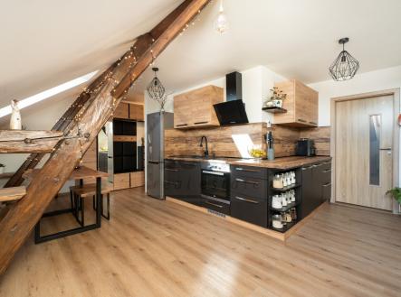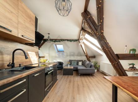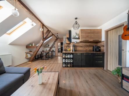 Nabízím k prodeji krásný podkrovní byt 2+kk v osobním vlastnictví. Nachází se ve 3.patře (4.NP) bez výtahu nově revitalizovaného činžovního domu a celkově čítá 69 m² čisté podlahové plochy. Byt je po vydařené rekonstrukci a díky přiznaným trámům je nejen stylový, ale také útulný. Kuchyně je prostorná a prakticky řešená. Propojení kuchyně s obývacím pokojem je velice moderní a působí vzdušným dojmem. Ve velké ložnici jsou vestavěné skříně, které nabízí dostatek úložného prostoru. V pěkné a světlé koupelně je rohová vana a toaleta. Topení i ohřev vody zajišťuje vlastní kombinovaný plynový kotel. Jedním z bonusů je vlastní komora na chodbě, kde je sympaticky umístěná pračka se sušičkou a regály na ukládání sezónních věcí.