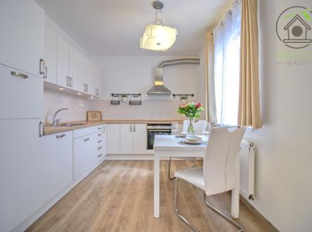 Kuchyně, která je zařízena vkusnou kuchyňskou linkou, nabízí mimo jiné i velké množství úložného prostoru a je vybavena vestavěnými spotřebiči, jako je horkovzdušná trouba, indukční varná deska anebo automatická myčka nádobí. Dále je kuchyně vybavena také velkou lednicí s mrazákem, mikrovlnnou troubou a jídelním stolem se židlemi.