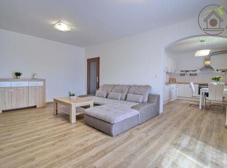 Poslední a zároveň největší místností, do které se dostaneme z centrální chodby, je obývací pokoj s kuchyňským koutem. Kuchyně je vybavena moderní kuchyňskou linkou s kvalitními spotřebiči, jako je například, sklo-keramická varná deska, elektrická trouba, lednice s mrazákem, nebo mikrovlnná trouba. Dále je kuchyně vybavena digestoří a nerezovým dřezem s odkapávačem.