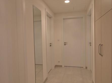 Po vstupu do bytu se ocitneme v chodbě s vestavěnou skříní, ze které se dostaneme dále do bytu. Vlevo se nachází vstup do prostorné koupelny, která je zařízena automatickou pračkou, umyvadlem se zrcadlem a toaletní skříňkou. Dále pak také toaletou a sprchovým koutem.