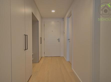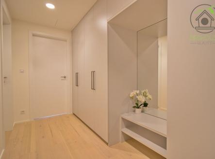 Po vstupu do bytu se ocitneme v centrální chodbě, ze které se dostaneme do dalších místností. Vpravo je situovaná šatna, která nabízí dostatek prostoru pro Vaše oblečení a obuv. Menší šatna se nachází také vlevo za posuvným závěsem.