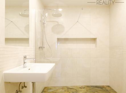 Koupelna se zděným jádrem je zařízena sprchovým koutem, umyvadlem s toaletní skříňkou a je zde samozřejmě dostatek místa pro automatickou pračku.